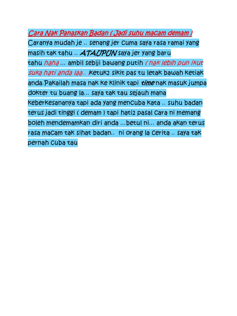 Tahukan anda demam adalah penyakit yang akan menimpa semua orang tidak kira muda atau tua. Cara Berpura Pura Demam. Berikut adalah antra perkara yang boleh dilakukan dirumah ketika demam panas.